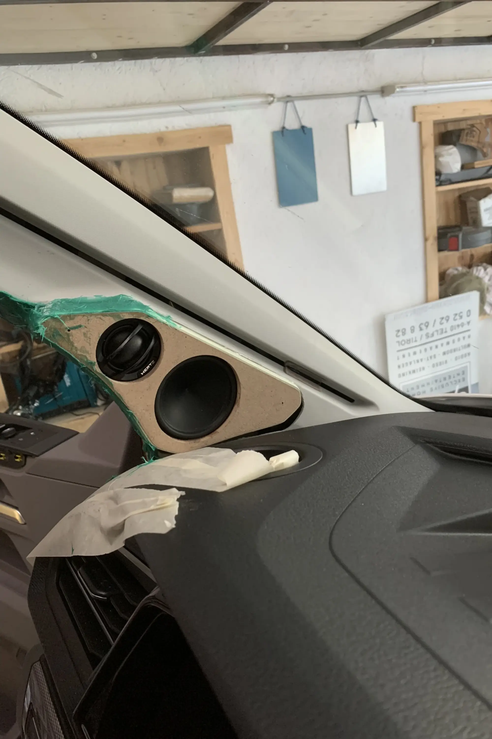 - Zusätzlich wurde die komplette A-Säule umgebaut, damit ich den Platz für Hoch und Mitteltöner hatte. Selbstverständlich wurde die A-Säule mittels Orgianlstoff bezogen, damit das ganze aussieht, als ob es so vom Werk geliefert worden wäre.